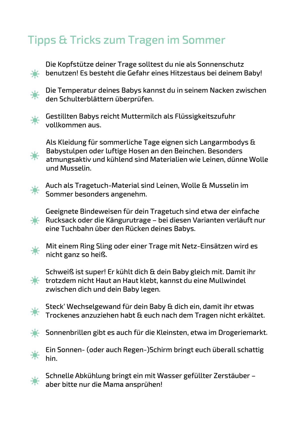Welche Materialien besonders angenehm & luftig zu tragen sind, worauf ihr ganz besonders achten müsst, oder zu welchen Tragehilfen man an heißen Tagen am besten greift. Das und mehr könnt ihr euch (entweder als Bilddatei oder als PDF) durchlesen, ausdrucken, und an die Wohnungstüre hängen. So vergesst ihr garantiert nichts & seid ganz schnell an der sommerlich duftenden Luft.